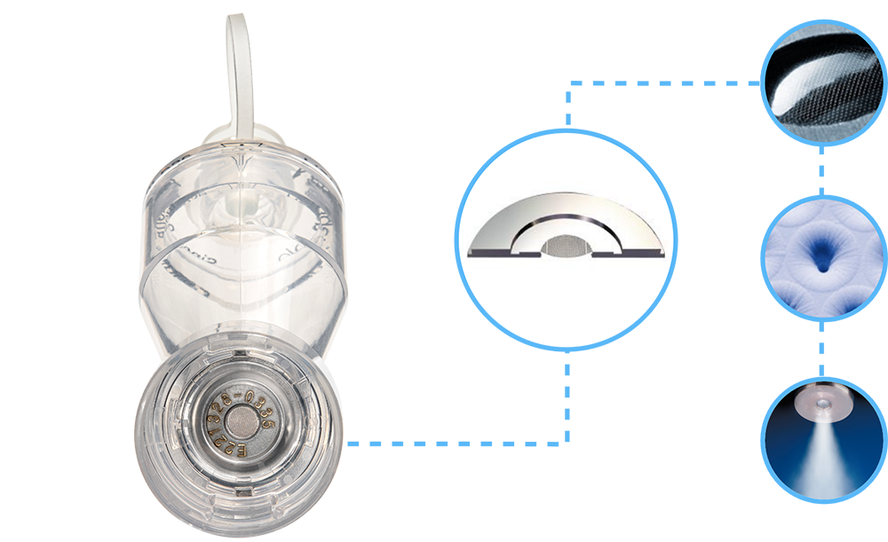 The aperture plate vibrates at 128,000 times a second. Each aperture plate has 1,000 precision formed holes, which act as a micro pump, drawing liquid and forming a low-velocity, fine-particle, nebulised mist